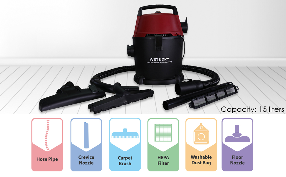 Package Includes Vacuum Cleaner, 5 Feet Flexible Hose Pipe, 2 x 1.5 Feet Extension pipes, Floor-cum-carpet brush, Wet brush with two separate mouths, Upholstery nozzle, Crevice Nozzle, Washable dust bag, HEPA filter, Instruction handbook, Warranty card