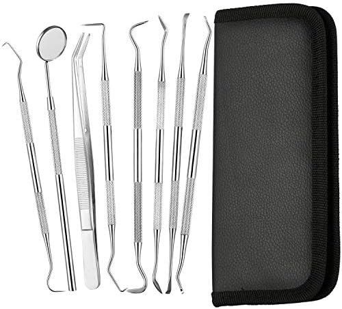 Professional 8-in-1 Oral Care Kit: Includes 1 hammer formed needle, 1 sawtooth needle, 1 sharp needle, 1 sickle dental scaler, 1 tweezers, 1 probe, 1 dental mirror and 1 hoe dental scaler, specifically designed for each skilled dentists and private use. All dental instruments are manufactured from excessive power chrome steel with antibacterial coating, polished to a mirror end, this rust-free oral hygiene device package is robust and sharp sufficient to take away plaque and tartar in or between your enamel.