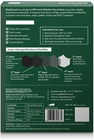Bodyguard N95 PM 2.5 masks is specifically designed to guard you from possible respiratory illnesses and allergy symptoms originating from the polluted air within the cities. It protects you from the widespread allergens like pollen, mud and air borne microbes within the setting. The Mask simply filters PM2.5 and supplies a contemporary air flow system that retains you to breathe simply. It can be utilized at anyplace like workplace, office, house, outdoors and so forth. The washable/reusable masks options an adjustable nostril clip pin that may be pressed to counter the particular design of your nostril for a cosy becoming. The N95 face masks is designed to put on comfortably for all in order that the wearers can increase the masks to cowl their nostril, mouth and chin. It comes with very gentle rounded ear loops, making them fairly comfy to put on.