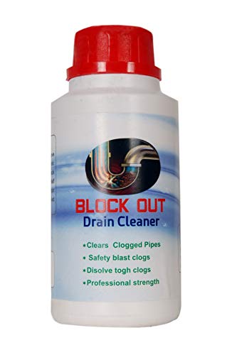 BLOCK OUT DRAINCLEANER 100% Pure Lye to Clear Clogged Drains, Sinks and Pipes. Simply add the flakes to the sink and pour water over the flakes. The Lye will dissolve all of the Oil / Food / Hair / Grease that has clogged drain pipes and clear them. Keep away from youngsters.