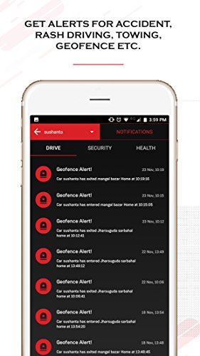 Alerts: Accident SOS Alert, Rash Driving Alert, Towing Alert, Geofence Alert, Ignition/Night Alert.