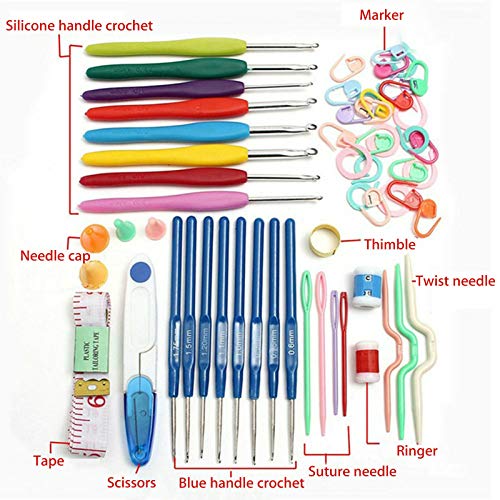 1 : 8pcs ( blue deal with crochet, mannequin: 0.6/0.7/0.9/1.1/1.25/1.4/1.5/1.6/1.75MM ) 8pcs PE tender deal with crochet 2.5/3.0/3.5/4.0/4.5/5.0/5.5/6.0MM 2 : 1pc yarn scissors Scissors . 3 : 2pcs plastic stitching needle ( 9CM ); 2 pcs plastic stitching needle ( 7CM ) 4 : 3pcs twist knitting needle 5: 4pcs silicone needle cap ( 2 massive 2 small) 7 : 1pc thimble 9: 1pc 60Inch tape measure ( Tailorang Tape ) 10 : 2pc counter ( Row counter ) 12: 10pcs plastic rings ( multi colours sew marke