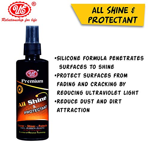 ALL SHINE AND PROTECTANT : is a singular polymer silicone system which penetrates surfaces to shine and defend vinyl rubber and plastic. It helps to guard surfaces from fading and cracking by decreasing ultraviolet mild. While bringing out colour, restoring luster and shine. Protects towards abrasion, reduces static electrical energy to scale back shines. Protects towards abrasion, reduces static electrical energy to scale back mud and grime attraction. If much less shine is desired, flippantly buff with a humid fabric.
